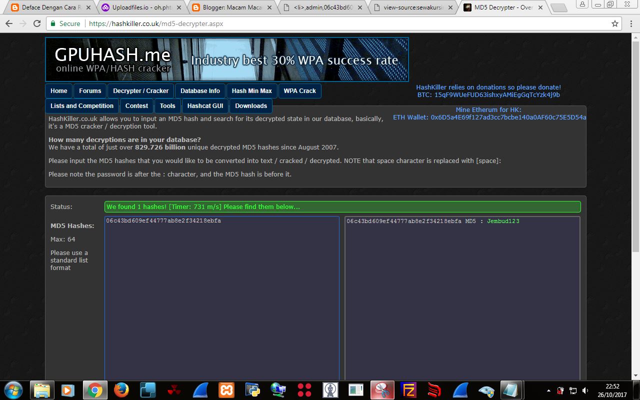 5. ok kita kan udh tau nih ya kan username sama passwordnya yg msih dalam bentuk Md5 sekarang kita Copy passwordnya itu yg di samping kanan tulisan admin, nah copy angkanya saatnya kita hash online passwordnya di https://hashkiller.co.uk/md5-decrypter.aspx ,,, nah dan jreng jreng ane udh berhasil nih gan dapet password aslinya :v,Untuk liat password aslinya nnti akan muncul di sebelah kanan, nih liat gambar